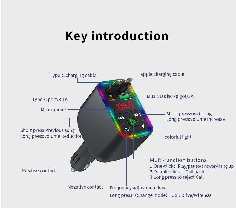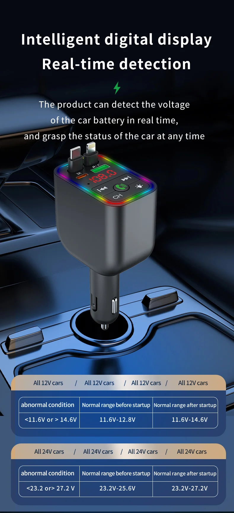 7:Cigarette lighter power supply: DC12V-24V voltage power supply; 8:Bluetooth version 5.3 FM transmitting frequency: 87.5-108Mhz