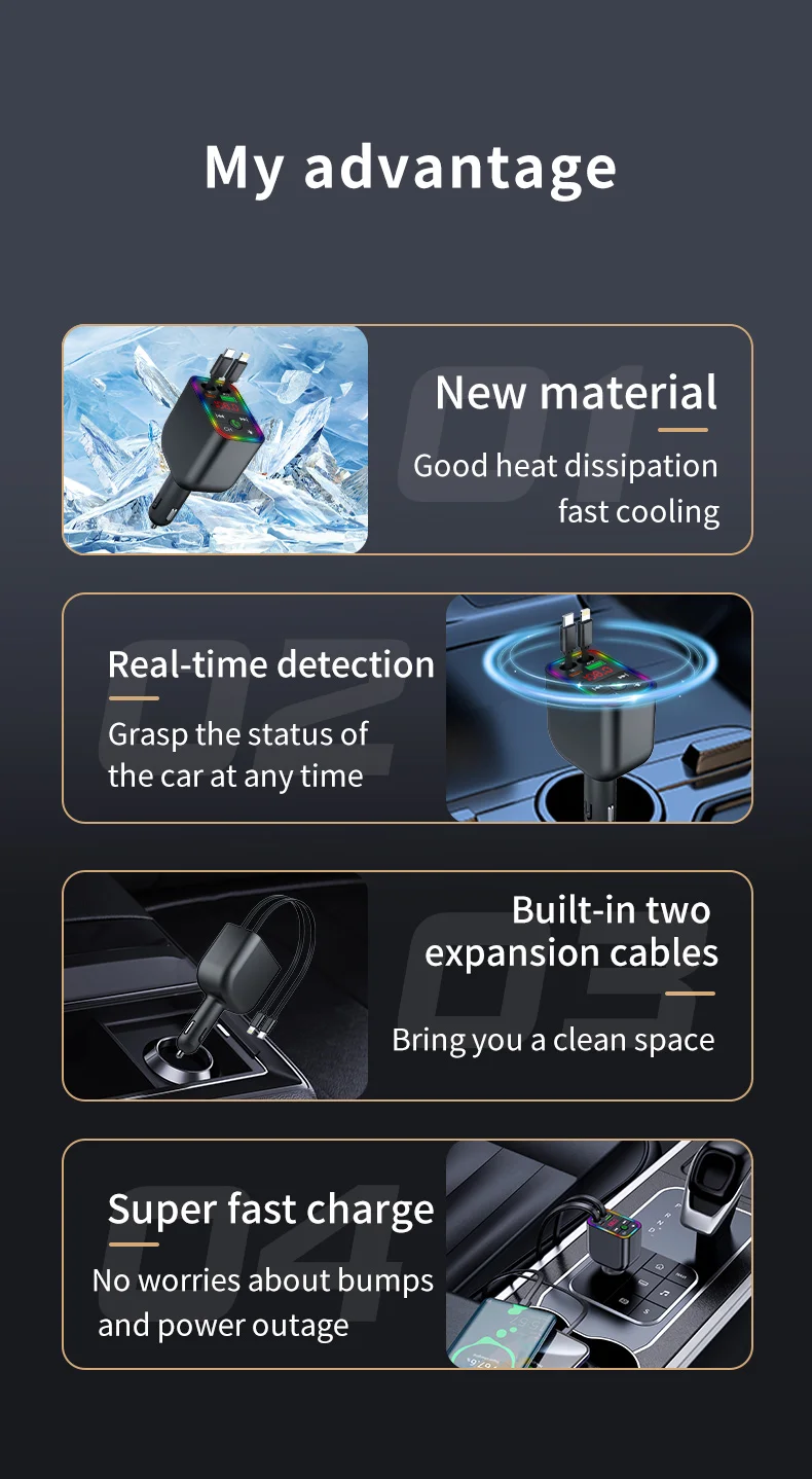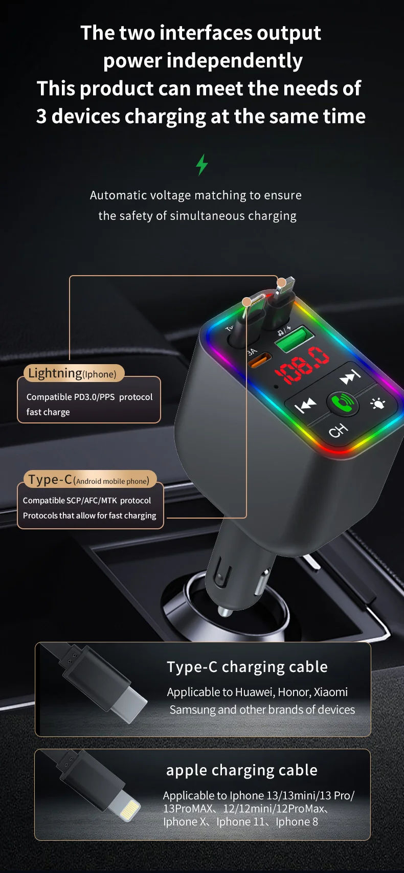 Y3 Car Bluetooth MP3 Transmitter - 4-in-1 Fast Charge Retractable Cable Car Charger, Portable Multimedia Player