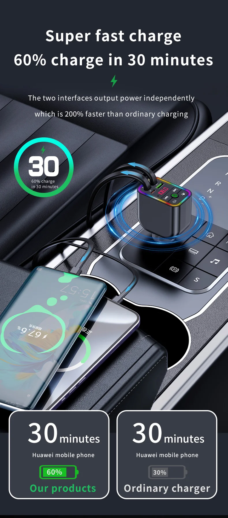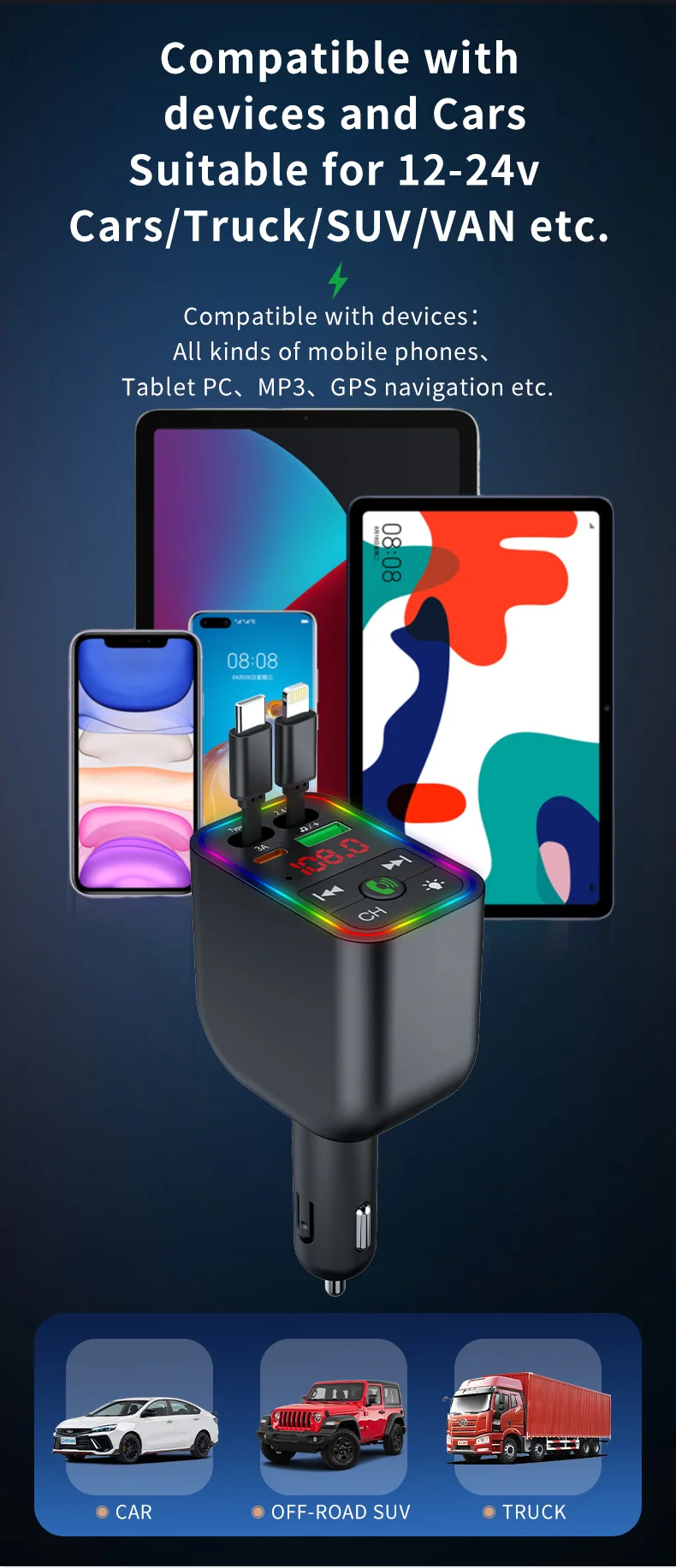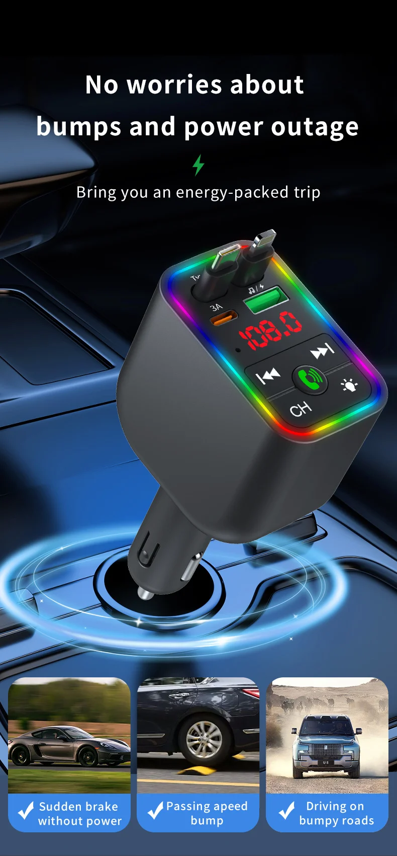 Y3 Car Bluetooth MP3 Transmitter - 4-In-1 Fast Charge Retractable Cable Car Charger, Portable Multimedia Player